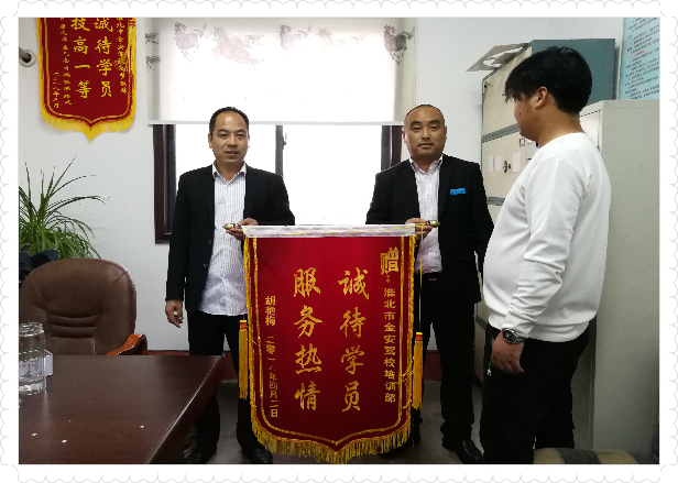 2018年4月2日,淮北市金安駕校學(xué)員胡艷梅來到金安駕校培訓(xùn)部,將一面繡有“服務(wù)熱情、誠待學(xué)員”字樣的錦旗送到培訓(xùn)部的工作人員手里,對培訓(xùn)部的所有工作人員表示感謝。