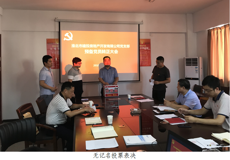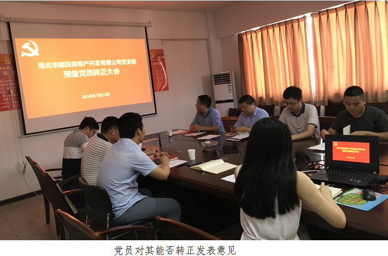 2018年7月13日下午,建投房地產(chǎn)公司黨支部在黨員活動(dòng)室召開(kāi)了預(yù)備黨員轉(zhuǎn)正大會(huì),研究討論公司支部預(yù)備黨員王申瑞轉(zhuǎn)正問(wèn)題。